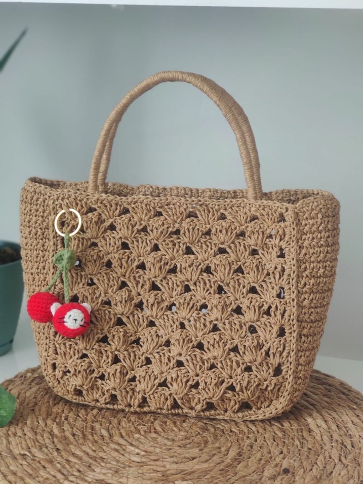 Dantel detaylı, renkli nakışlı kahverengi örgü kadın çanta. Bohem tarzda, kiraz anahtarlık aksesuarı ile tamamlanmıştır.