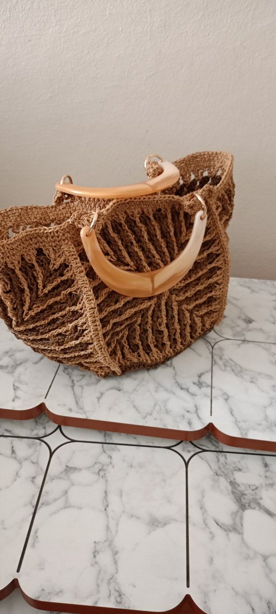 Dantel detaylı, parlak kahverengi örgü kadın çanta, ahşap saplarıyla bohem tarzı yansıtıyor. Günlük kullanım için uygun.