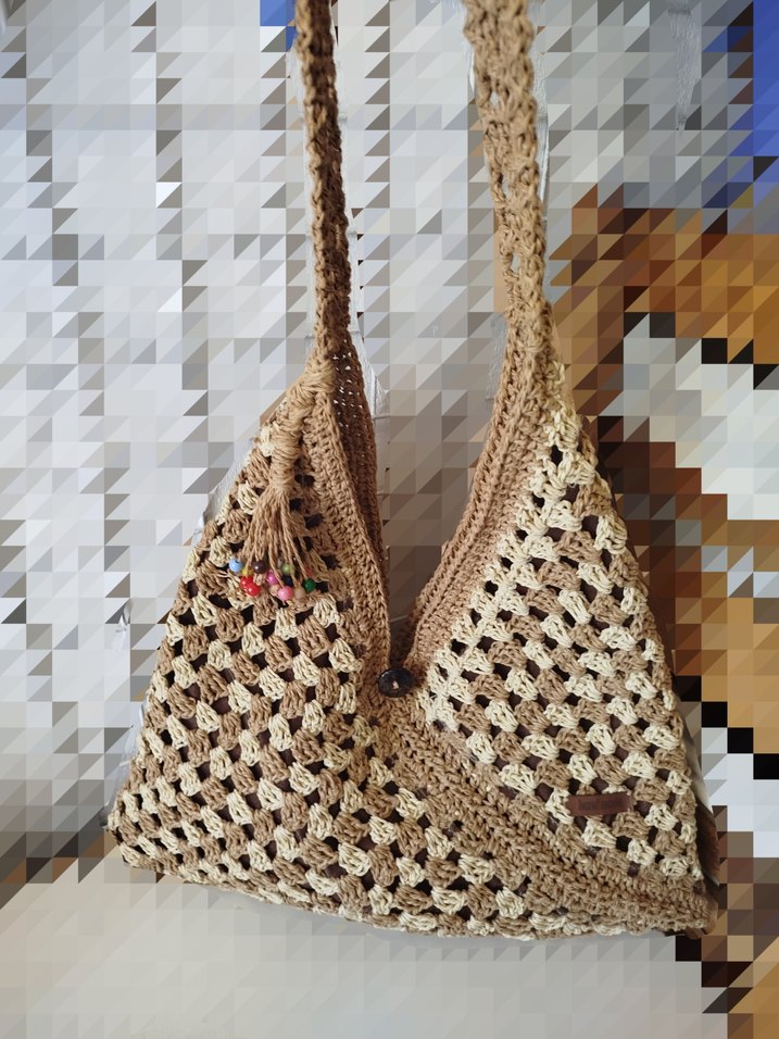 Dantel detaylı açık kahverengi örgü bohem kadın çanta, yumuşak dokulu ve günlük kullanım için uygun. Özel el işi görünümüyle dikkat çekiyor. genişlik 35cm