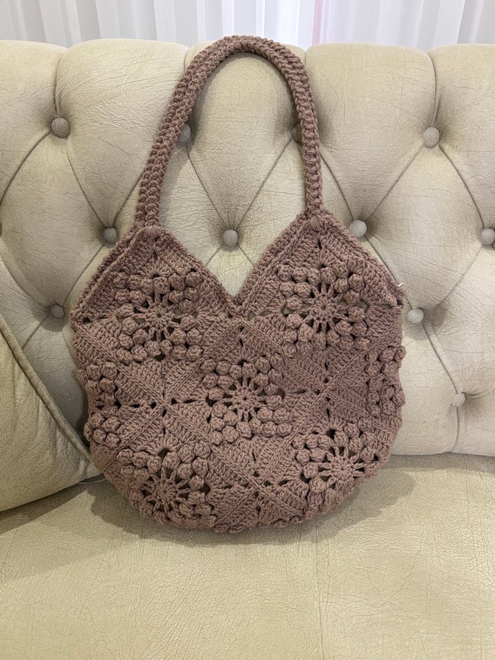 Dantel detaylı kahverengi örgü kadın çanta, rahat ve bohem stilde, günlük kullanıma uygun. Yumuşak dokulu ve desensiz tasarıma sahip.