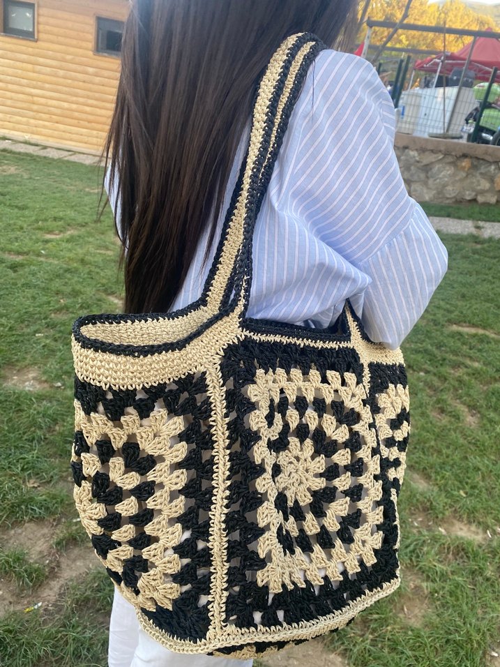 Halam örüyor kişisel ozel sipariş alinir . Koyu kahverengi örgü kadın çanta, desenli ve dantel detaylı, günlük kullanım için uygun bohem tarzda.
