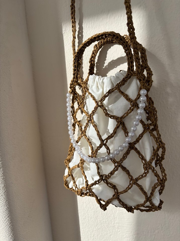 Dantel detaylı, beyaz işlemeli kumaş astarlı örgü bohem kadın çantası. İnci saplı, Paris esintili retro ve hippie tarzını yansıtır. ✨