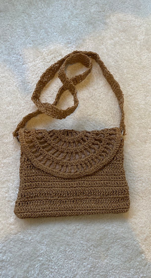 Kahverengi örgü çapraz çanta, dantel detaylı ve bohem tarzda, günlük kullanıma uygun yumuşak dokulu ve ayarlanabilir askılı.