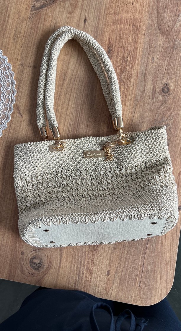 Kadın çanta, örgü dokusu ve dantel detaylarıyla klasik zarafeti yansıtır. Yumuşak gri tonları ve bohem tarzıyla dikkat çeker.