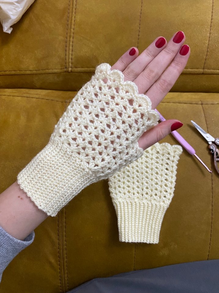 Beyaz örgü eldivenler, dantel desenli ve bohem tarzda. Yumuşak dokulu, parmakları açık ve rahat kullanımlı. istediğiniz ölçüde örülür