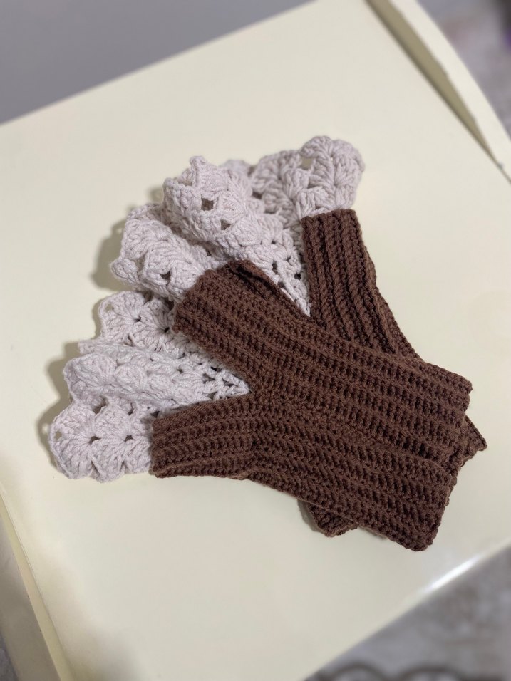 Kahverengi ve bej renklerde, dantel detaylı örgü kadın eldiveni. Yumuşak ve sıcak tutar, bohem tarzıyla dikkat çeker.