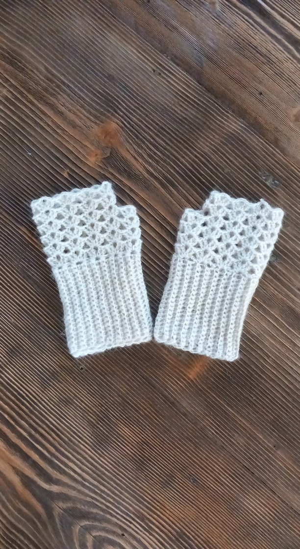 Dantel detaylı krem rengi örgü kadın eldivenleri, rahat ve bohem tarzda, nostaljik bir görünüm sunar.