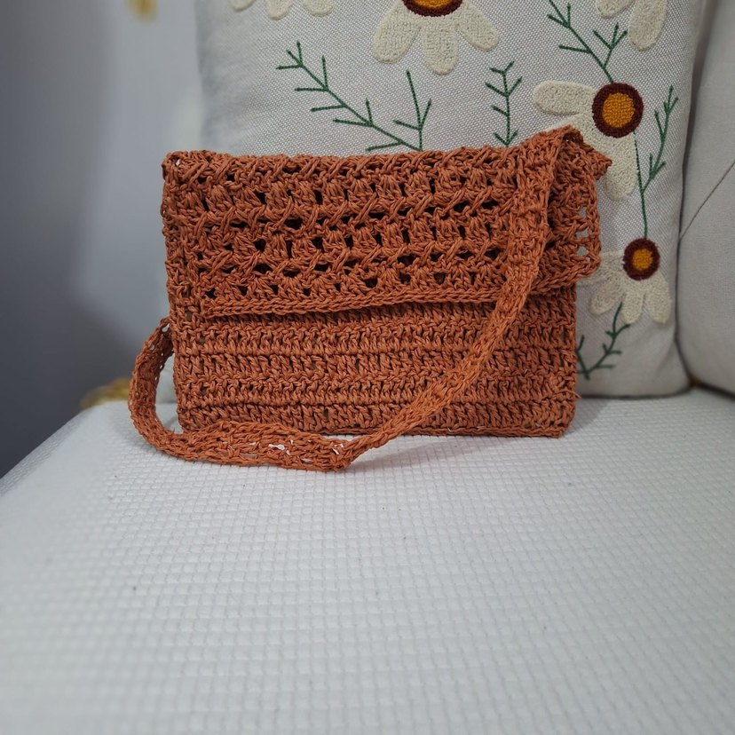 Kahverengi örgü kadın çantası, dantel detaylı ve bohem tarzda, desen içermeyen sade tasarım. Günlük kullanım için uygun.