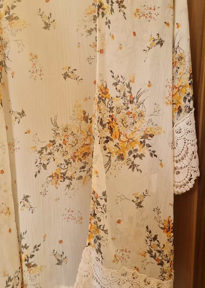 hiçbir kusuru yok, gömleklerin üstüne günlük hayatta da plajda pareo olarak da kullanılabilir kolları güpür detaylı çiçekli, s beden ama L'ye kadar rahat olur, kremli yeşilli çiçekli