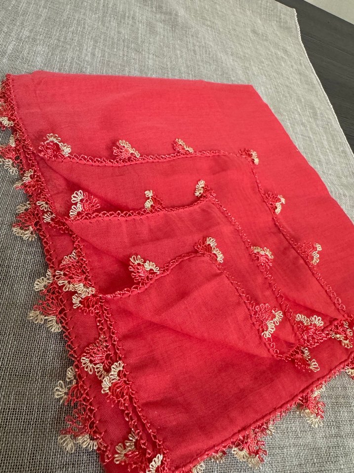 Parlak kırmızı renkte, dantel detaylı kadın fular. Yumuşak tekstil malzemeden, vintage ve bohem tarzda, retro ve hippie havası verir.