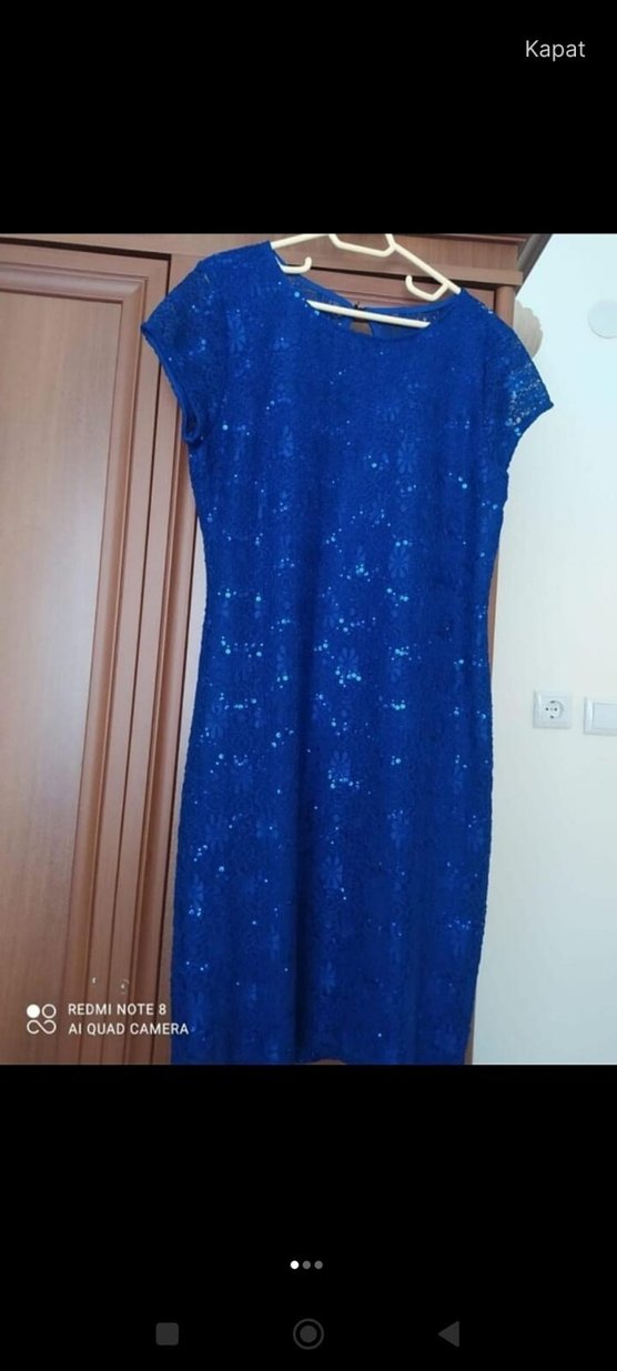 Parlak mavi renkte, dantel detaylı, V yakalı ve kolsuz uzun elbise. İnce kesimiyle parti için uygundur. ✨