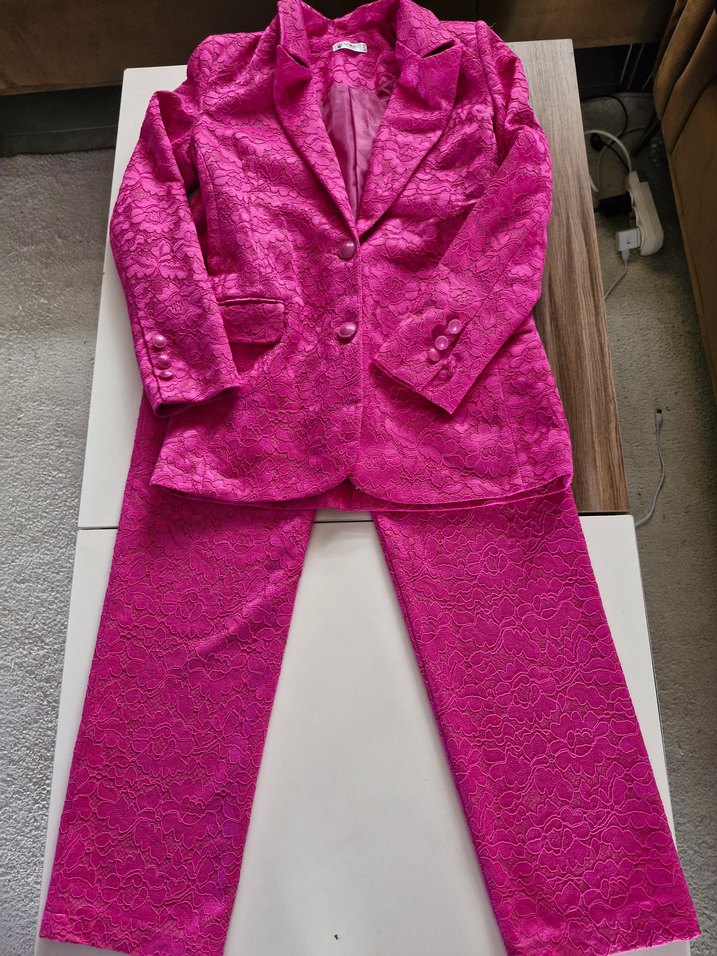Kadınlar için uzun kesim, regular fit blazer takımıdır. Dantel detaylı, sentetik kumaştan yapılmış ve parlak pembe yılan desenine sahiptir. Ofis için şık bir tercihtir.