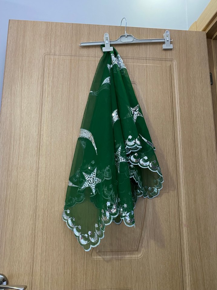 Dantel detaylı, parlak yeşil renkte şalı. Sentetik kumaştan üretilmiş, sade ve geleneksel tarzda, bohem esintili. #askerörtüsü