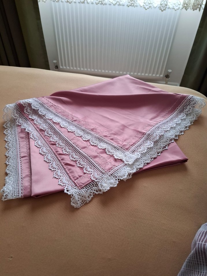 Kadınlar için pembe, yumuşak ve ipeksi 150ye 150 saten güpürlü masa örtüsü