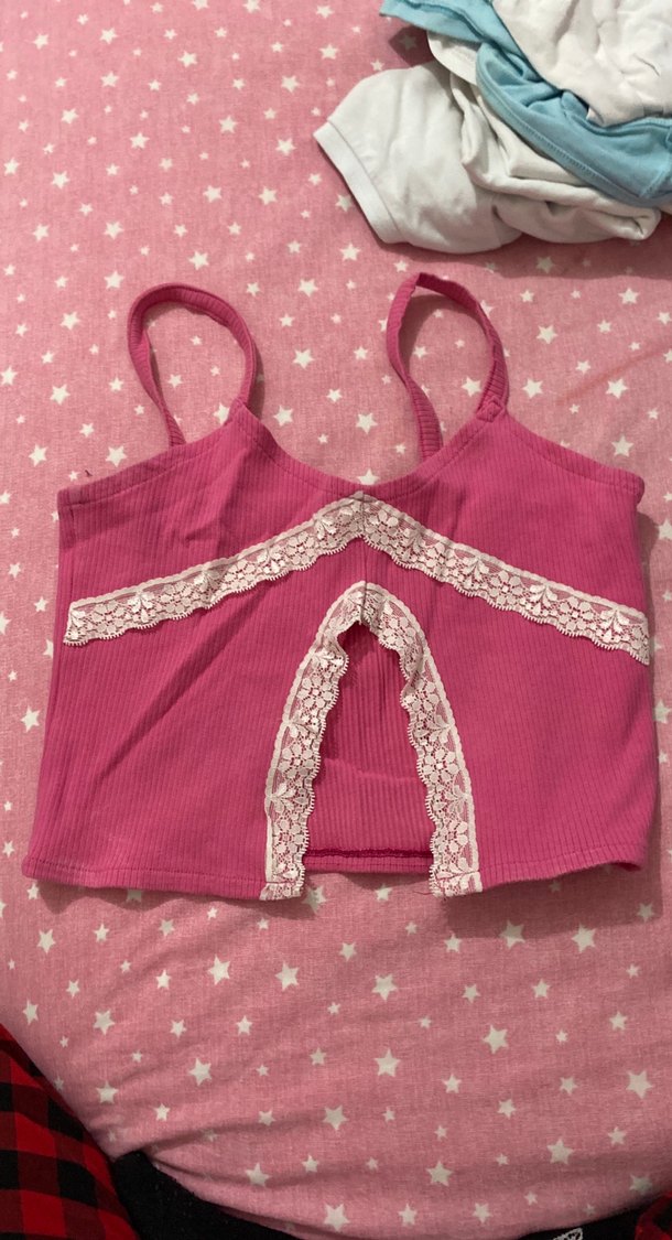 Dantel işlemeli, askılı ve straplez yakalı, pembe renkli, fit kesim atleti, yumuşak örme kumaştan.