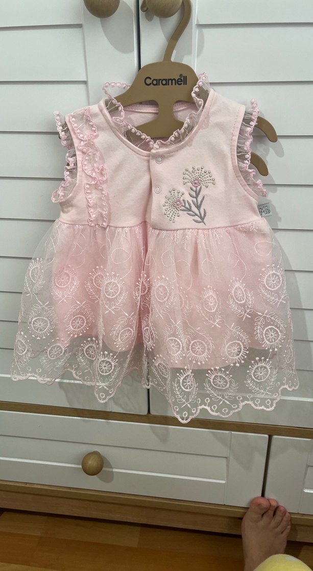 Dantel detaylı, nakış işlemeli, askısız ve kolsuz pembe bebek elbisesi. Miniborn marka, 6-9 aylık sadece bir kez giyilmiştir.