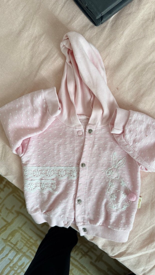 Pastel pembe renkte, dantel detaylı ve nakış desenli bebek hırkaKapüşonlu ve çıtçıtlıdır.