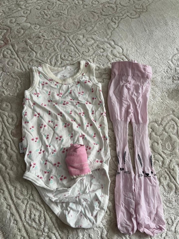 Dantel detaylı, pastel pembe renkli kolsuz bebek kız takımı. İçinde desensiz body ve sevimli tavşan desenli çoraplar bulunur.