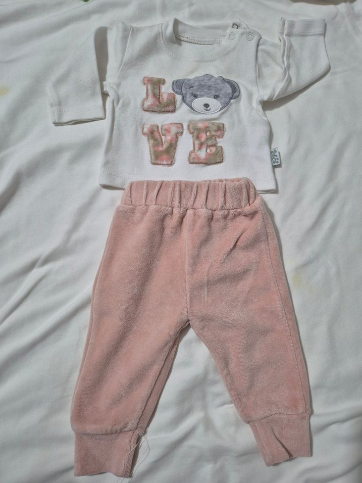 Dantel detaylı, baskılı ayıcık desenli uzun kollu üst ve yumuşak pastel pembe pantolondan oluşan bebek kız takımı.