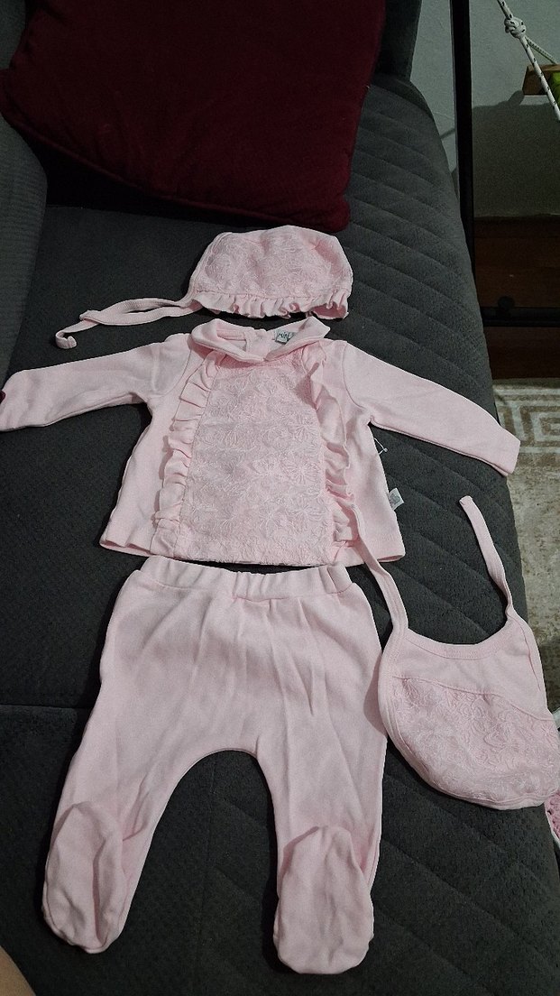 Uzun kollu dantel detaylı üst, uyumlu pantolon, şapka ve önlükten oluşan pastel pembe bebek kız takımı.