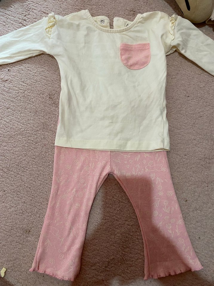 Uzun kollu, pastel pembe renkte dantelli bebek kız takımı. Üst krem rengi, pembe cep detaylı; pantolon hafif desenli ve dantel süslemelidir.