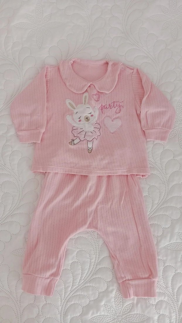 Pastel pembe renkli, uzun kollu bebek kız takımı. Üstte dantel ve nakışlı sevimli tavşan deseni bulunur. Yumuşak ve rahat kumaş.