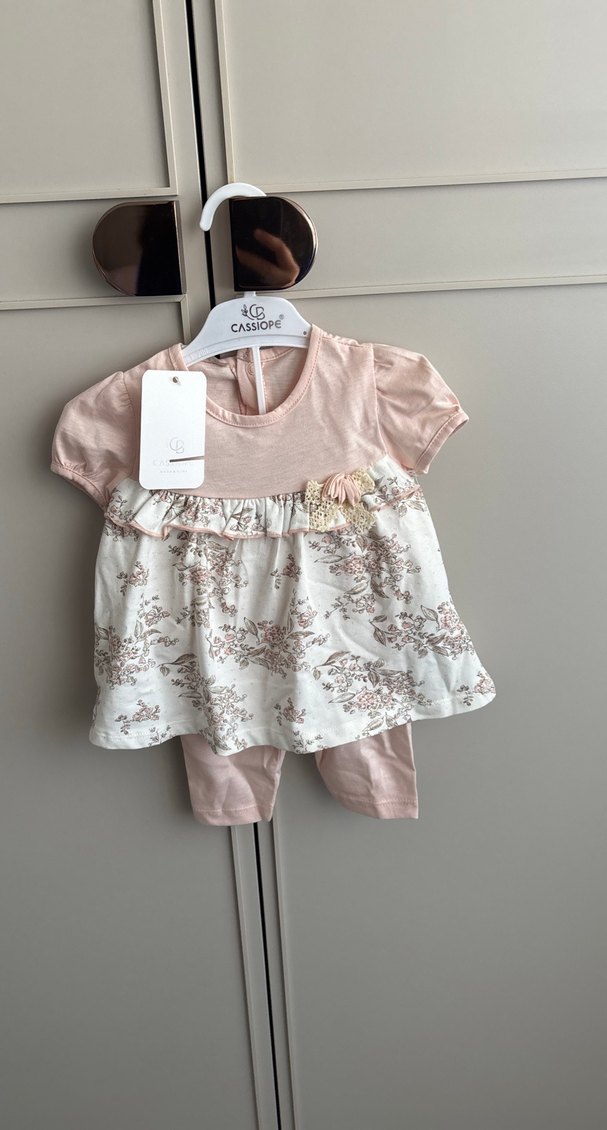Kısa kollu, pastel pembe ve çiçek desenli dantel detaylı bebek kız takımıdır. Yumuşak kumaşı rahatlık sağlar. 9 ay