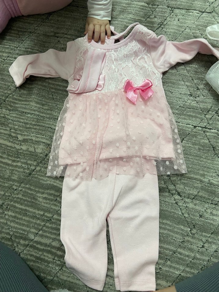 Uzun kollu, pastel pembe renkli bebek kız takımı. Nakışlı dantel detay ve fiyonk süslemeye sahip, yumuşak ve rahat kumaş.
