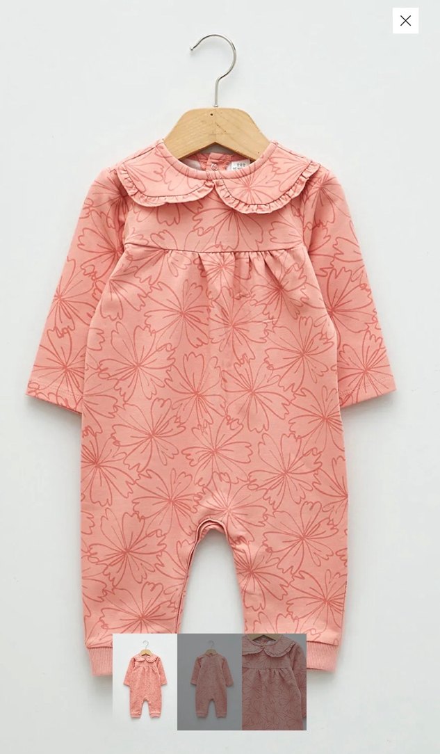 Pastel pembe renkli, çiçek desenli bebek kız tulumu, yakasında dantel detayları bulunur. Uzun kolludur ve yumuşak kumaştan üretilmiştir.