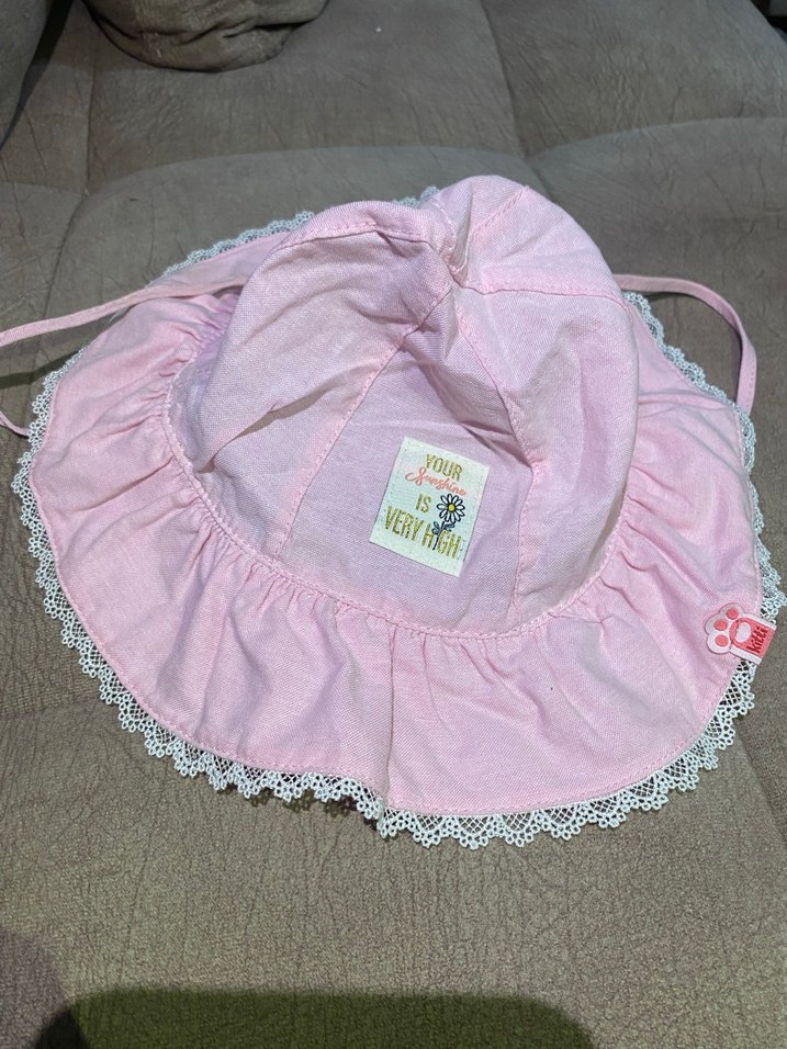 Pastel pembe renkli, dantelli ve nakış işlemeli bohem tarzda bebek şapkası. Yumuşak sentetik kumaştan üretilmiş, üzerinde 'YOUR LIFE IS VERY HOME' yazılı etiket bulunur.