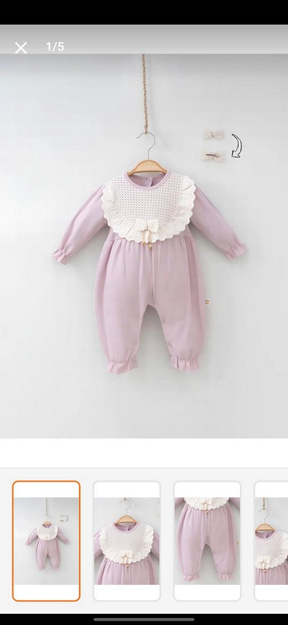 Pastel pembe renkte, dantel ve nakış detaylı uzun kollu bebek tulumu, volanlı manşetlerle tamamlanmıştır.
