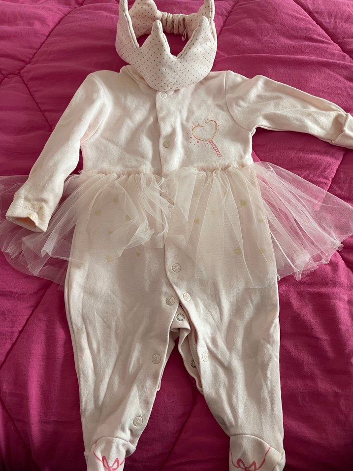 Dantel detaylı, nakışlı desenli pastel pembe bebek tulumu, çıtçıt düğmeli ve uyumlu saç bandı ile birlikte. ** Kolunda küçük lekeler var foto ekledim kıvrıldığında görünmüyor
