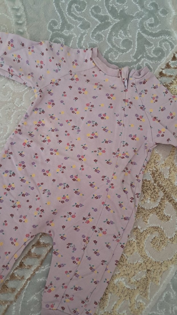 Uzun kollu, bisiklet yakalı, pastel pembe renkte, çiçek desenli ve dantel detaylı bebek tulumu.