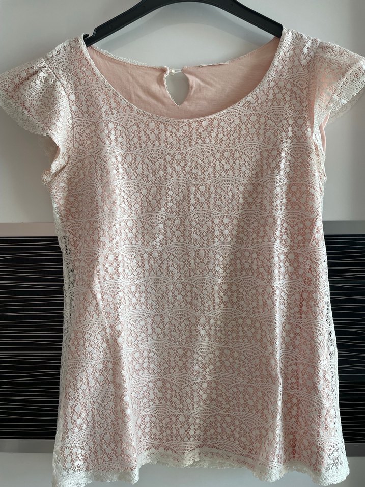 Dantel detaylı, yuvarlak yaka ve kısa kollu pembe örme bluz, bol kesim ve midi boyda, günlük bohem tarzı için uygun. Ürün görüldüğü gibidir.