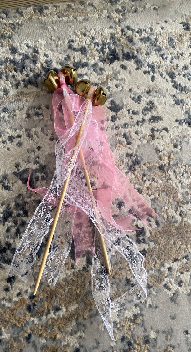 Bohem tarzda, pastel pembe dantel ve işlemeli kurdelelerle süslü, küçük altın renkli çanlı tahta çubuklu aksesuar #çan #zil #düğünhediyelik