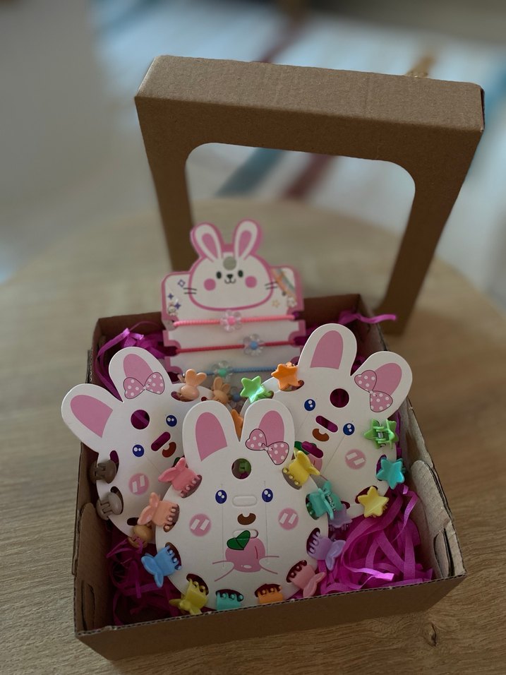Dantel detaylı, pastel pembe ve baskılı tavşan desenli bohem çocuk saç bantları ve toka seti.