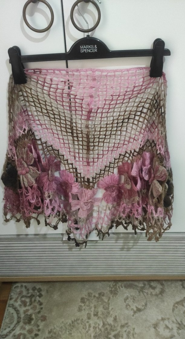 Pastel pembe renkte, dantel detaylı ve çiçek desenli bohem tarzda örgü şal. Retro ve hippie görünüme uygundur. El örgüsüdur çeyizlik şal olarakta kullanıla bilir