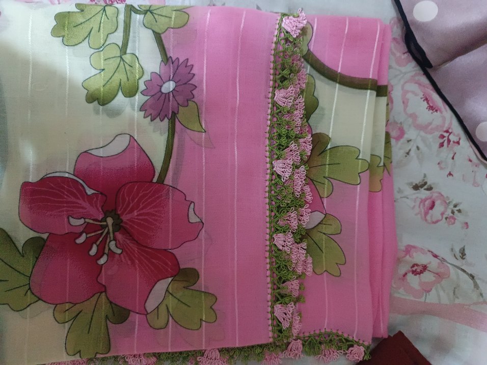 Pembe renkte, dantel kenar detaylı ve çiçek desenli kadın fuları. Yumuşak dokulu tekstil kumaştan, bohem tarzına uygun pastel renklerde.