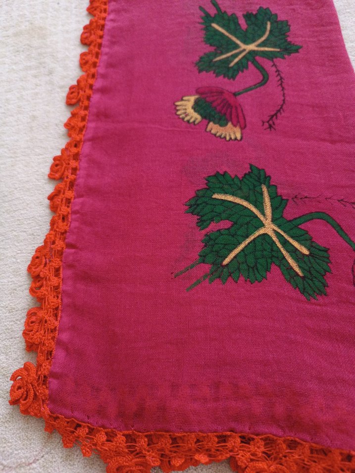 Renkli pembe tekstil üzerine çiçek desenleri ve dantel detaylı kenarlarıyla bohem tarzda kadın fularıdır.