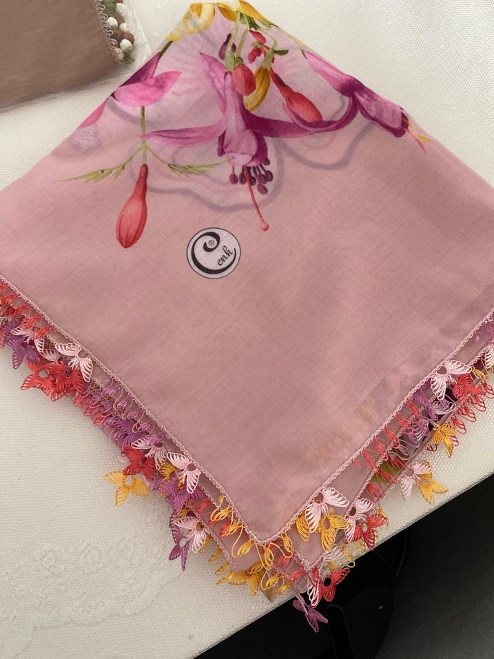 Pembe renkte, dantel detaylı ve çiçek desenli bohem kadın fuları. Yumuşak tekstil kumaştan yapılmıştır, pastel tonlarıyla retro ve hippie tarzını tamamlar.
