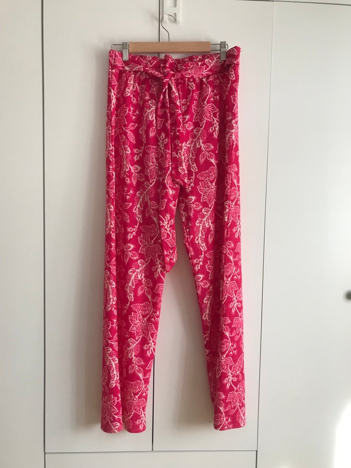 Renkli pembe batik desenli, dantel detaylı, bol kesim uzun bohem kadın kumaş pantolon.