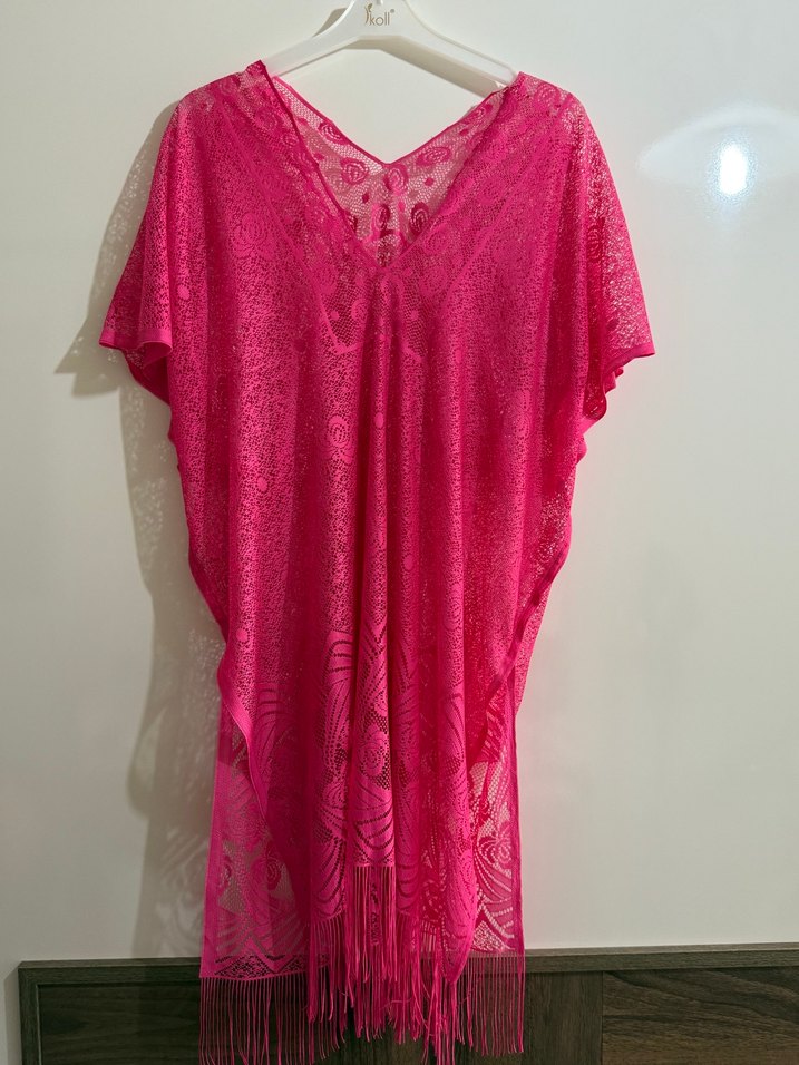 Dantel detaylı, kısa kollu, bol kesim pembe bohem kadın pareo. Uzun boyu ve renkli batik deseni ile günlük kullanıma uygundur.