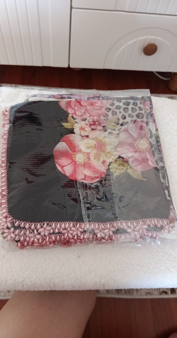 Sentetik kumaştan, koyu pembe renkli, çiçek desenli ve dantel detaylı bohem tarzda kadın fular.