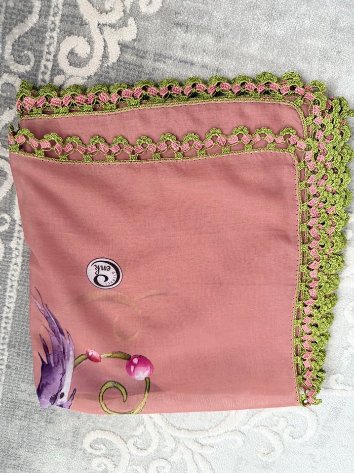 Cenk marka tığ oyası ,Pastel pembe renkte, dantel kenarlı ve hafif çiçek desenli bohem tarzı kadın fularıdır. Yumuşak tekstil malzemeden üretilmiştir, hippie ve retro stiline uygundur.