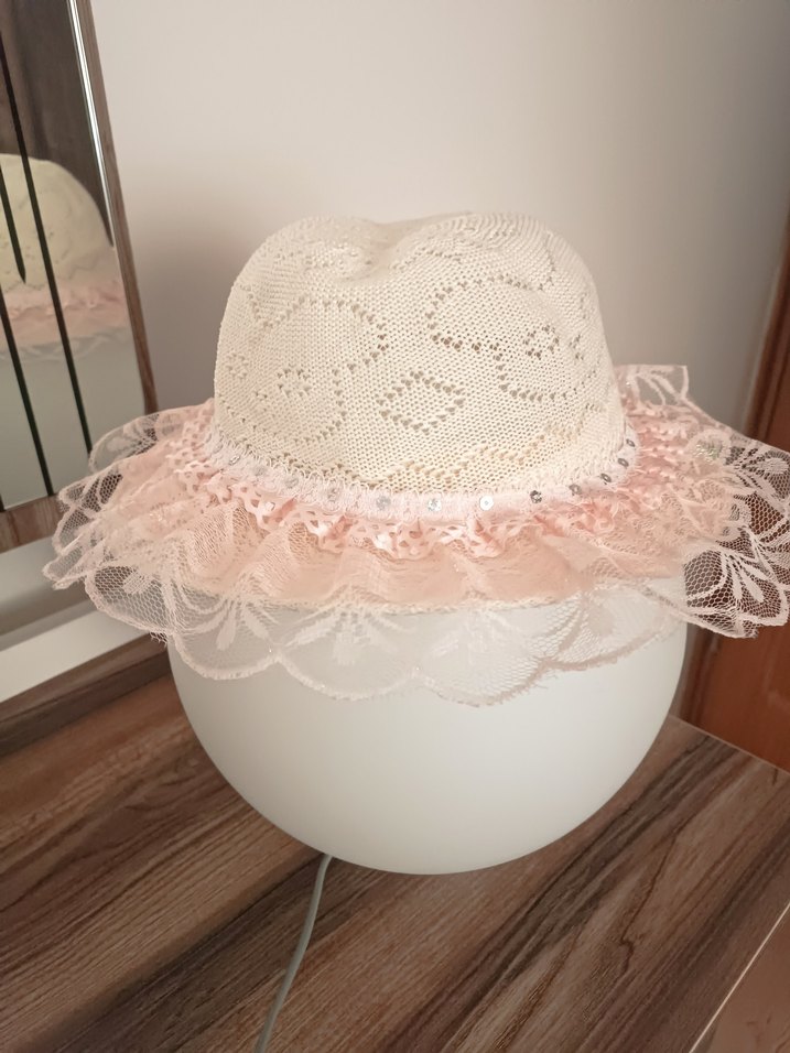 Pembe renkli, dantelli ve nakışlı detaylara sahip, bohem tarzda kız çocuk örgü şapkası.