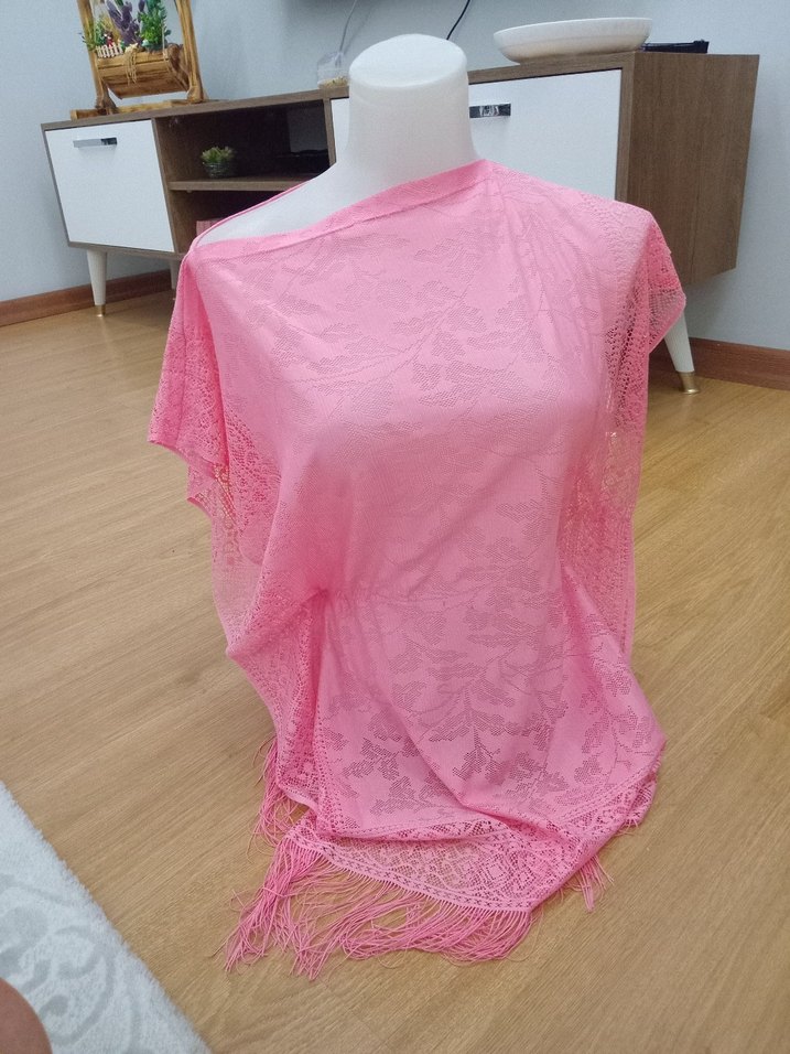 Pembe renkte, dantel detaylı ve püsküllü kenarları olan bohem pareo Yumuşak sentetik kumaştan üretilmiştir, pastel tonlarda, retro ve hippie tarzlara uygundur.