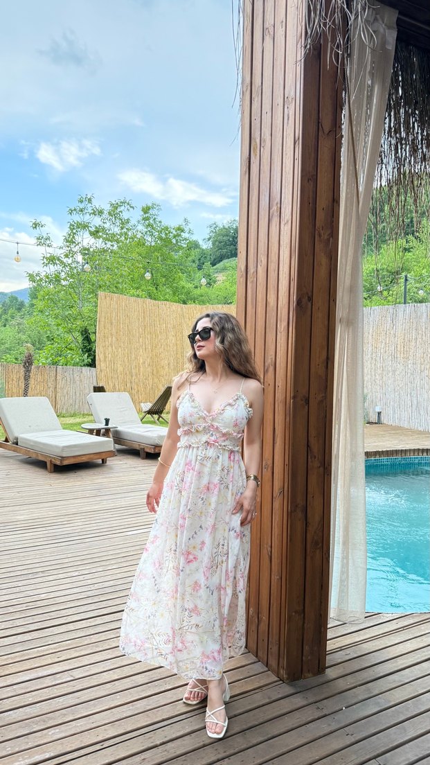 Dantel detaylı, askılı, pembe bohem uzun elbise. Rahat kesim ve straplez yakaya sahip, açık hava için uygun. Tie-dye desenli.