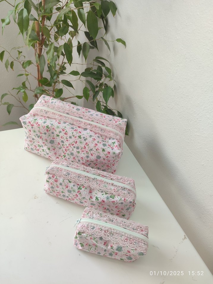 Sentetik kumaştan yapılmış, dantel detaylı pembe çiçek desenli makyaj çantası. Günlük kullanım için uygun, vintage tarzda. set içeriği 3 farklı boy.