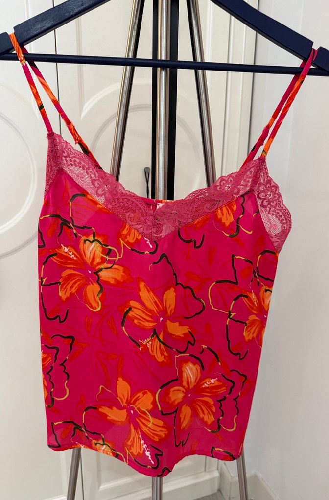 Pembe renkli, çiçek desenli ve dantel detaylı kısa atlet. İnce askılı ve vücuda oturan kesimiyle romantik akşamlar için uygun.