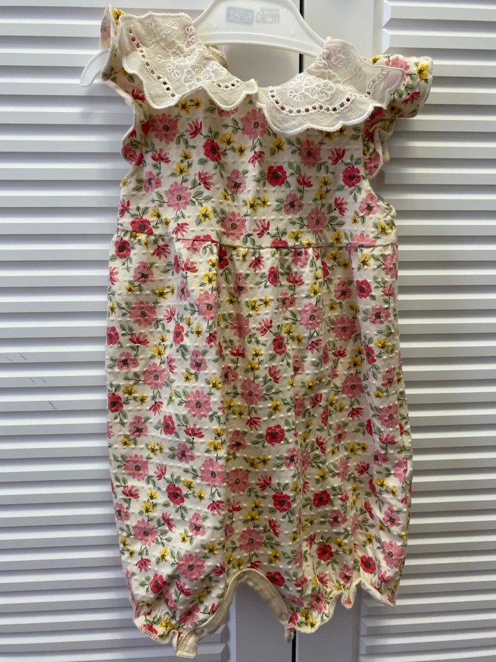 Pastel pembe, çiçek desenli ve dantel yakalı bebek tulumu, yumuşak kumaştan üretilmiştir.